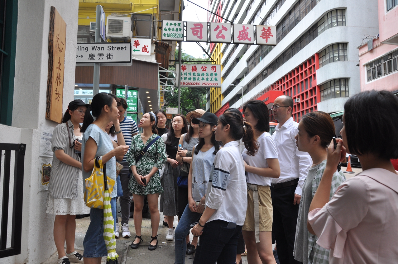 为深入学习和了解香港社区发展的历史以及现状,3日上午圣雅各布福群会“保护蓝屋”负责人向我们展示了香港蓝屋的发展过程、现状以及为保护蓝屋所遇到的困难。本着“以人为本”的社会工作服务理念,在社会工作者和当地居民及其他人员的共同努力下,向当地政府争取到了“留屋留人”的保护方案,允许14户原居民继续留住,延续老湾仔的社区人情以及保留唐楼的多元生活文化,城市的发展与文化保护,由此得以共存。蓝屋中由社区义工运营管理的“香港故事馆”期望引起公众人士对社区文化保育的关注,并作为社区参与的平台,建立街坊对社区的认同。