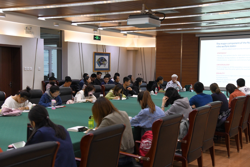 第一场讲座“北欧国家的社会政策和治理”中,Stein教授从为什么要研究社会政策和福利国家谈起,阐明了不同福利国家的不同原则,由此引入了北欧福利国家这一主题。教授通过历史、特征、成功报道等几个题目全方位的介绍了北欧模式,并着重对北欧福利国家的国家性特征作了讲解。另外,教授引用了许多中国学者对北欧模式的看法,分别对积极的和批判的观点进行了讨论。最后,教授还介绍了本世纪以来北欧福利国家所面临的挑战,包括人口老龄化、全球化、私有化、负担能力等几个问题,并以上问题提出了一些展望。