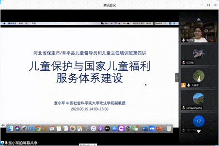 副教授、硕士生导师、少年儿童研究所所长童小军老师作题为《儿童保护与国家儿童福利服务体系建设》的专题培训第四讲。童老师对之前三场培训的内容先进行了系统回顾,并从问题回应的视角出发,阐释了国家为什么要设立儿童主任和儿童督导员岗位、岗位设置与国家儿童福利服务体系建设之间的关系,并为学员系统地分析了儿童保护与国家儿童福利体系建设的框架内容,为儿童主任、儿童督导员如何做好这一岗位服务提供了非常好的建议。