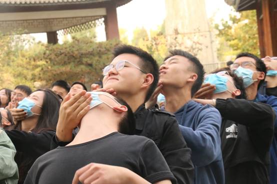 首先,活动主教练带领同学们进行了热身活动和破冰小游戏。随着教练一声令下,同学们按规定排好了队形。大家听从口令,在规定时间内和尽量多的人握手、拥抱,在场地上恣意奔跑,气氛格外欢乐。