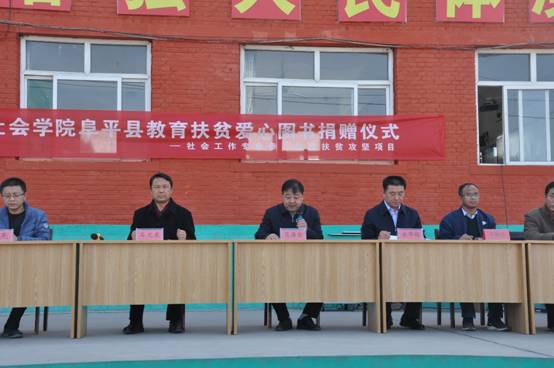 党总支书记石文东、阜平县政府副县长范海金、保定市民政局领导慈善事业促进和社会工作处处长刘亮、保定市社会工作协会秘书长穆炜、阜平县民政局局长金华栋、阜平县教育局副局长杨二军、五个受捐赠贫困中小学校长以及新澳彩论坛