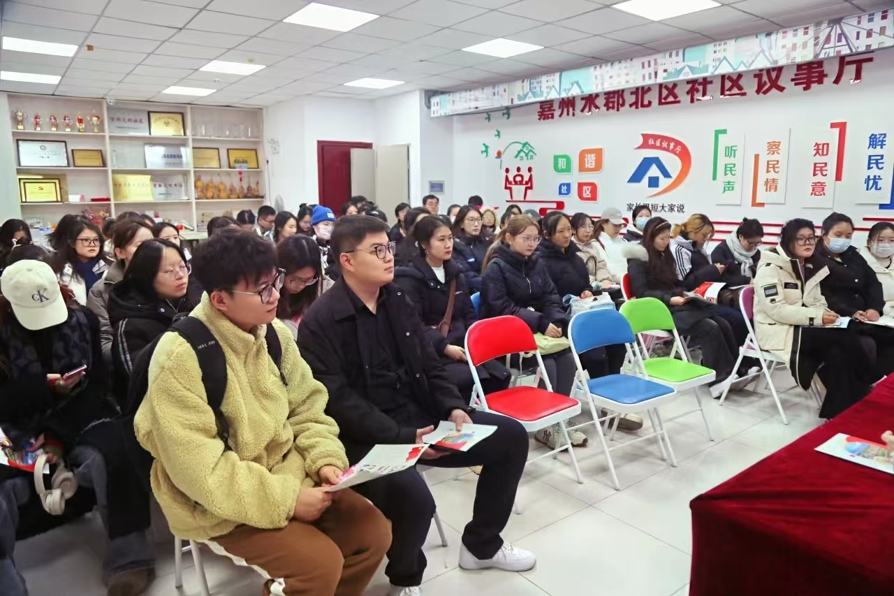 最后,来到文明实践站,同学们聆听社区书记的感受并与之交流。社区书记首先对社区议事厅做简单介绍,包括社区的人口、商户等内容,其中还谈到社区绿化面积等问题。随着社区的发展,居民的满意度较高,认同感也在不断增强。社区书记也分享了自身在社区工作中的感受。在交流环节,赵一红教授表达了对社区书记的认可,同时也以垃圾分类问题为例,对嘉北社区在处理该问题的高效率表示赞赏。