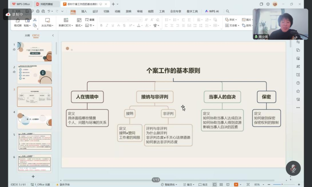 周少贤老师围绕“个案工作基本原则”并结合多个实务案例进行分享。周老师系统阐释了社会生态系统理论(“套娃模型”),结合内蒙古牧区创新服务、老旧小区环境整治等典型案例,深入剖析微观、中观、宏观环境对基层工作的递进影响,并深入分析了“人在情境中”这一基本原则,为参训学员厘清科学化、情境化的工作逻辑。培训同步突出实践导向,通过分析“垃圾清运纠纷调解”、“居家养老方案制定”等案例,引导学员掌握非评判沟通、当事人自决和需求分层响应等核心技能。最后,周老师又强调了尊重和理解服务对象的重要性以及使用保密原则的不同情境等,为乡工们坚持个案工作基本原则,做好个案工作提供了专业指引。
