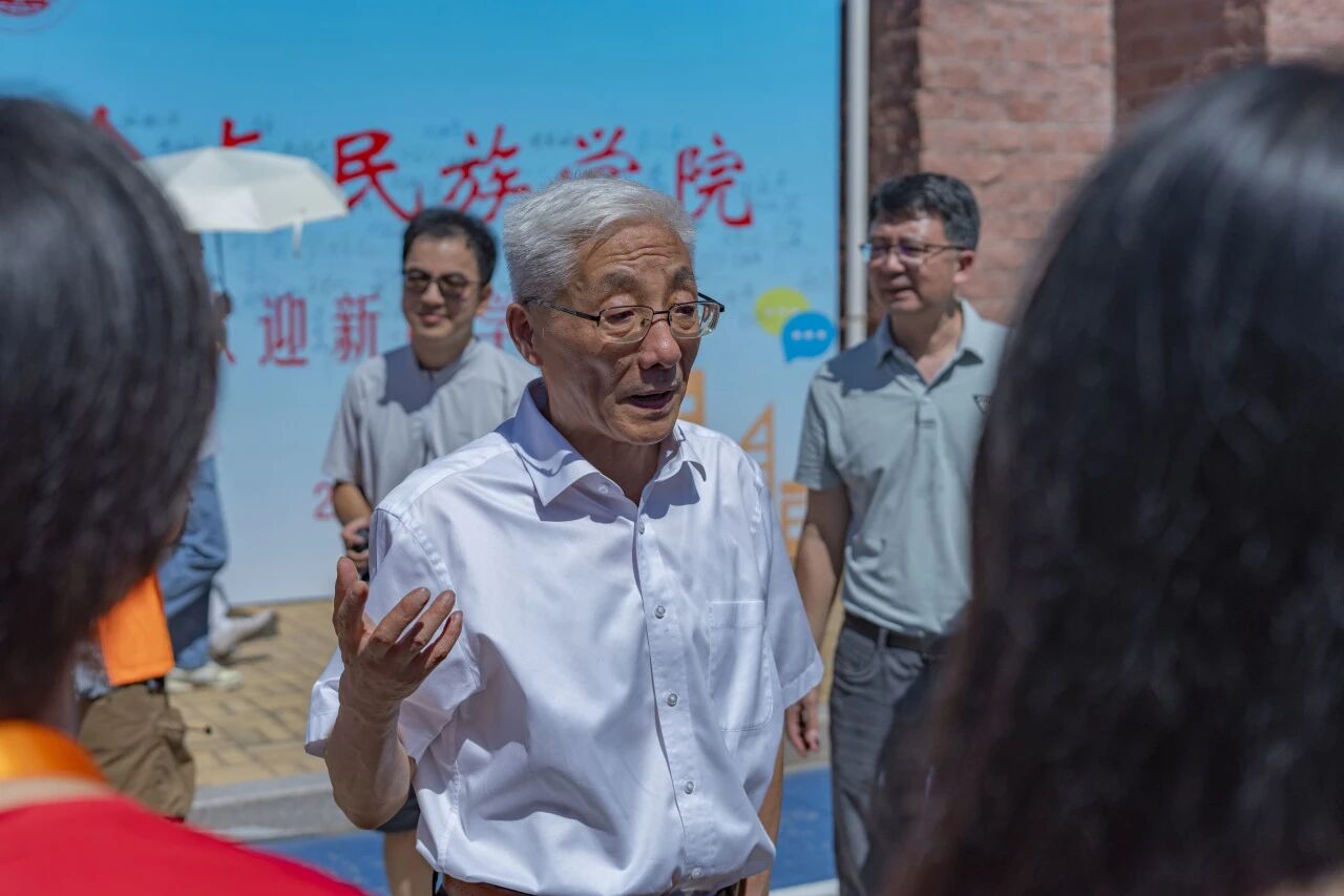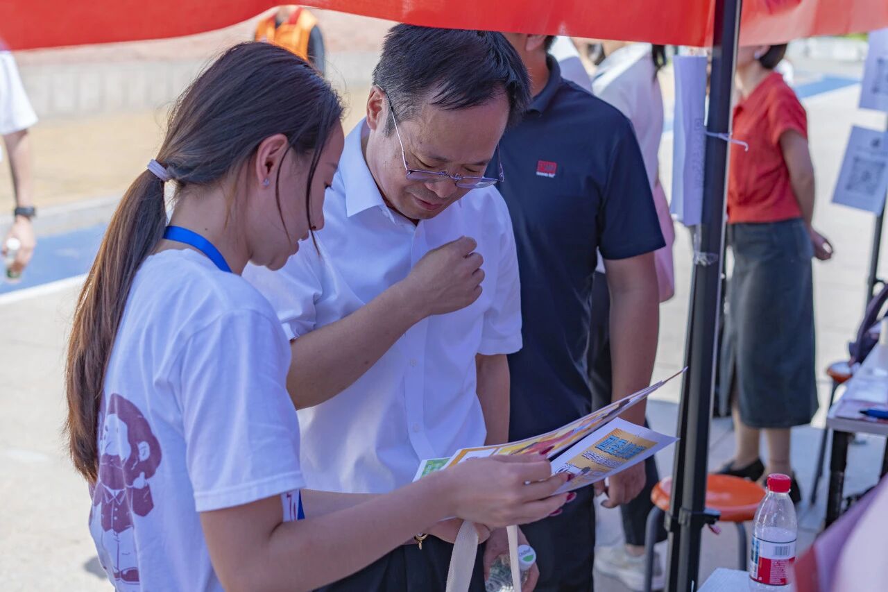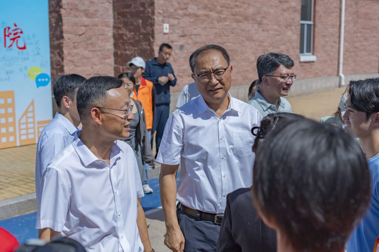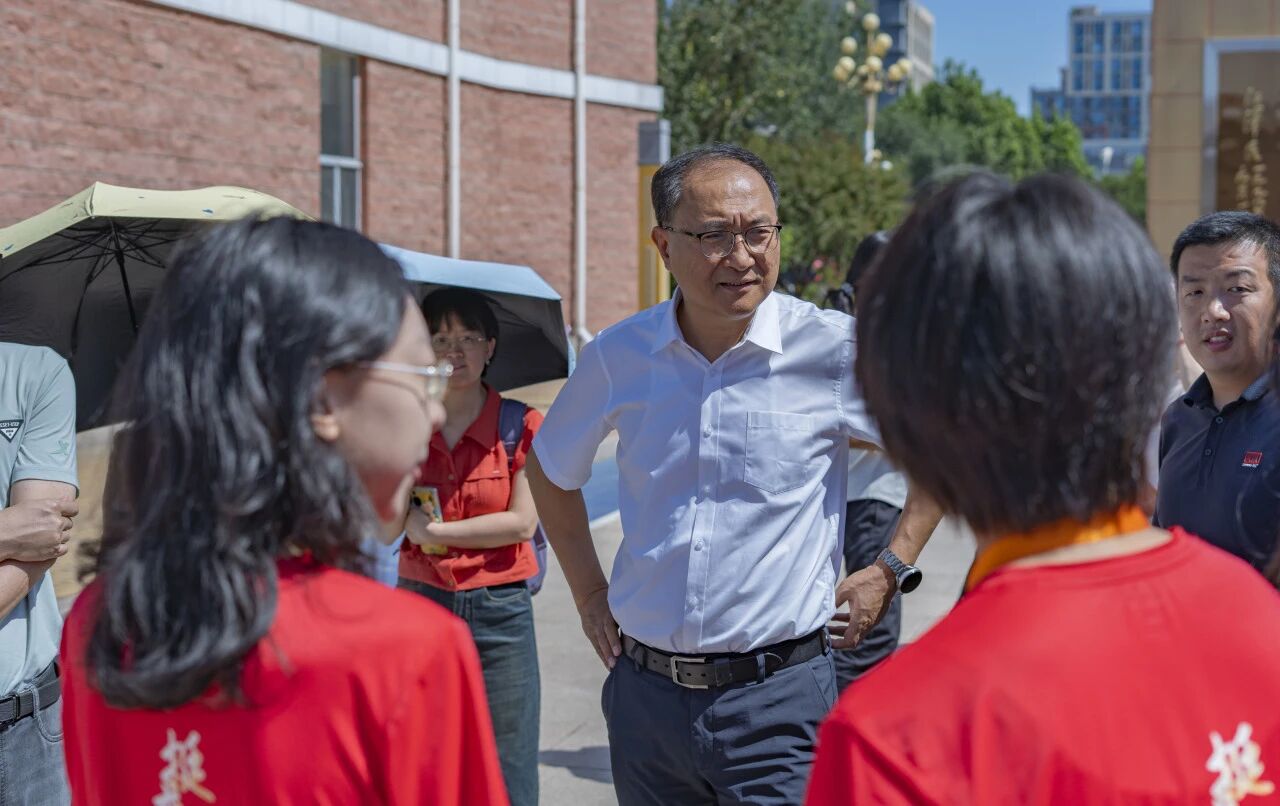 2025级新生报到情况,和报到新生亲切交谈,并向迎新的志愿者们表示问候。