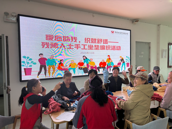 参与活动的残障村民们专注投入,即便双手微微颤抖,也始终认真地穿梭毛线。随着时间推移,原本松散的毛线在指尖逐渐成型,一个个色彩各异的坐垫雏形慢慢展现。当看到自己亲手编织的作品时,大家脸上都露出了自豪的笑容,纷纷互相展示交流,活动室里满是欢声笑语,温暖的氛围感染了在场每一个人。活动尾声,大家抱着自己的编织成果合影留念。