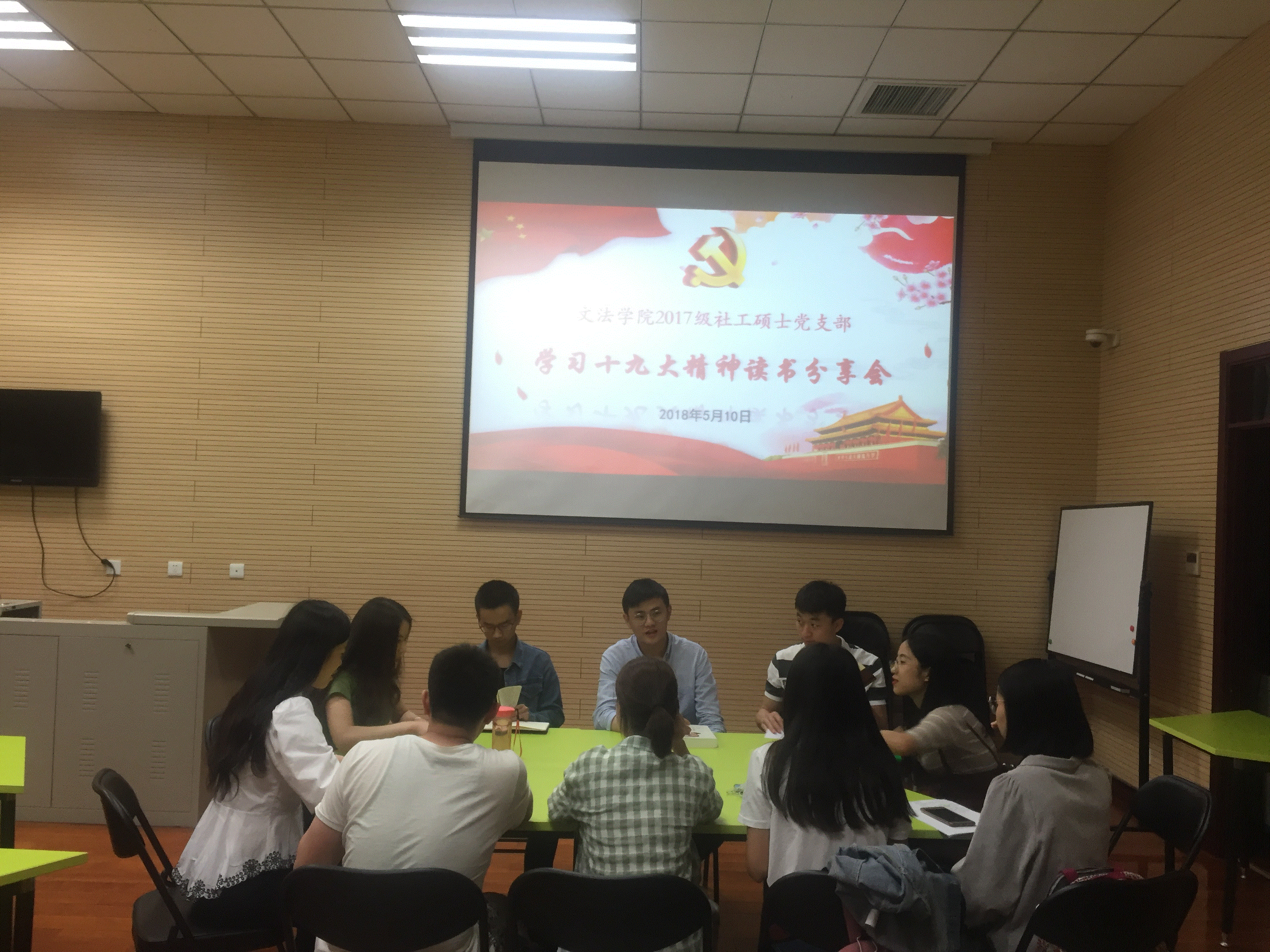 2017级社会工作硕士党支部在教学楼202教室举行了学习十九大精神读书分享会。党支部全体党员围绕《习近平谈治国理政》、《党的十九大报告学习辅导百问》、《一篇读罢头飞雪,重读马克思》三本读物,结合学习实际和专业实践,畅谈读书心得与学习体会。读书会由党支部书记向绪鹏同学主持。