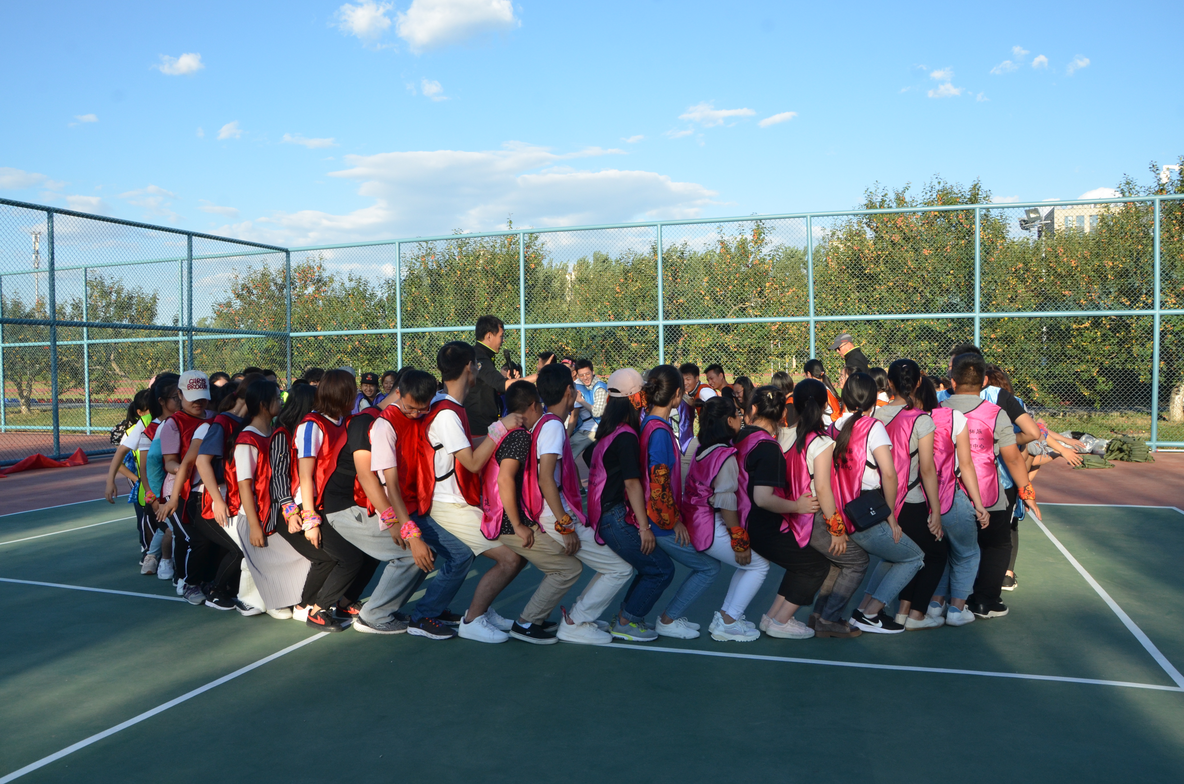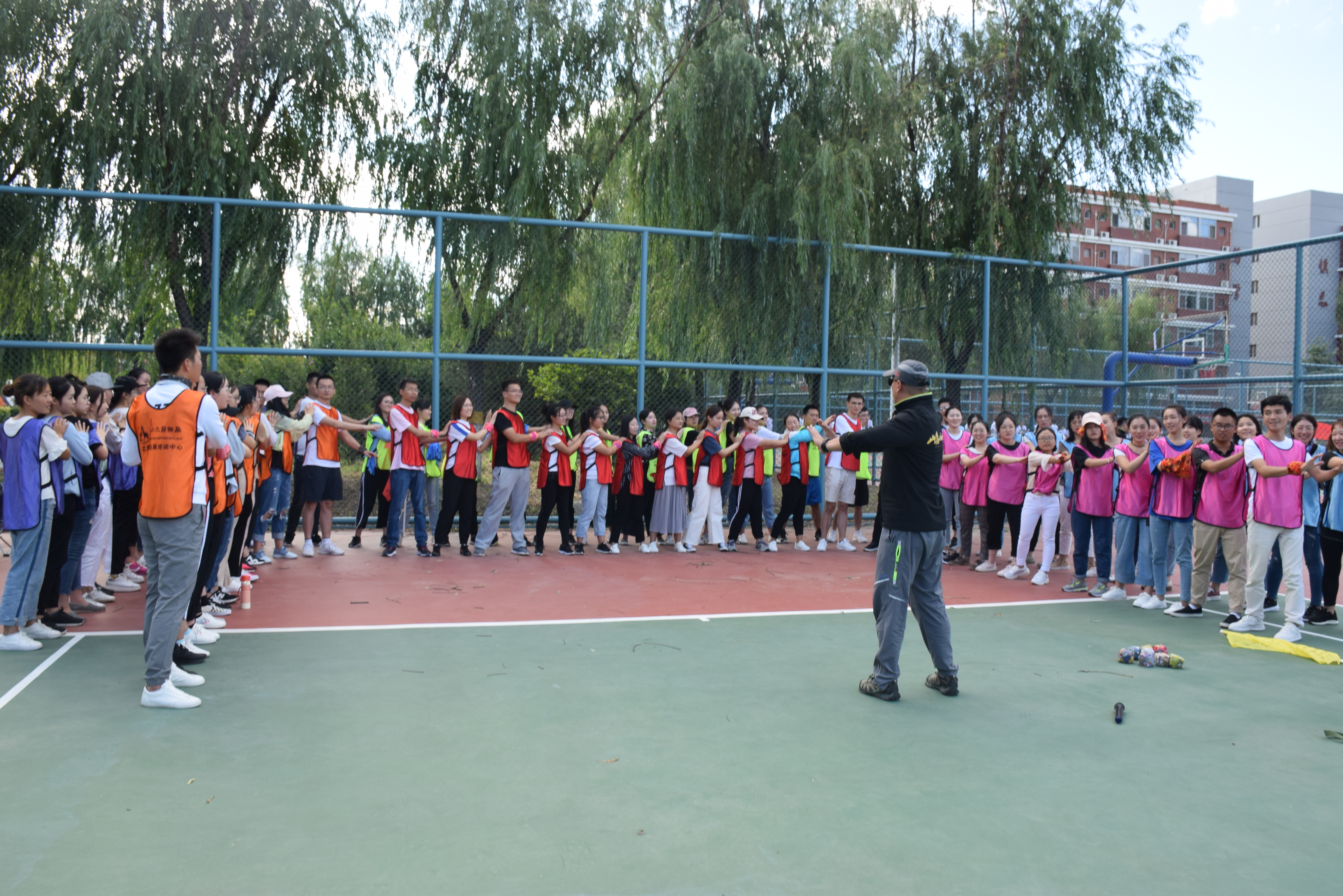 最后环节是“万里长城永不倒”,即所有人形成一个紧密的人圈,缓缓下蹲,每个人坐在后面一个人的腿上,全体成员坚持10秒以上才算成功。如果成员之间缺乏信任或其中任何一个人出差错,都有可能导致整个团队的失败。最终,在全体成员的相互帮助与共同努力下最后一个环节也圆满完成。在活动最后,教练对此次团建活动进行总结并为师生拍照留念。