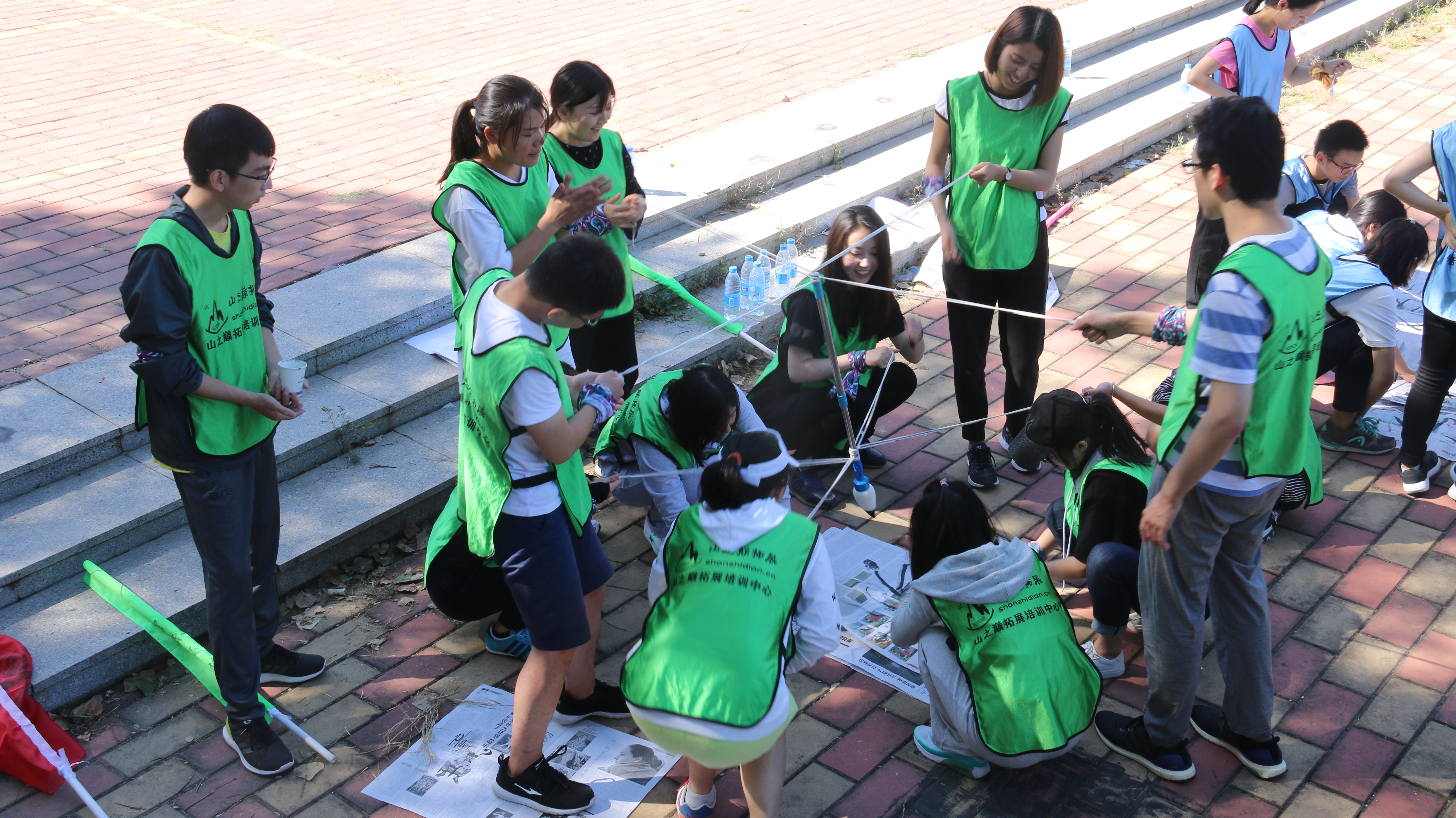 首先,新生拓展活动为消除大家的陌生感先进行 “破冰游戏”,使大家以轻松愉悦的状态参加活动。接下来,在教练的带领下,大家分成6个小组,分别一起沟通讨论设计队名、口号、队形、队旗等,诠释并展示团队文化内涵,体现积极、阳光、正能量的元素。