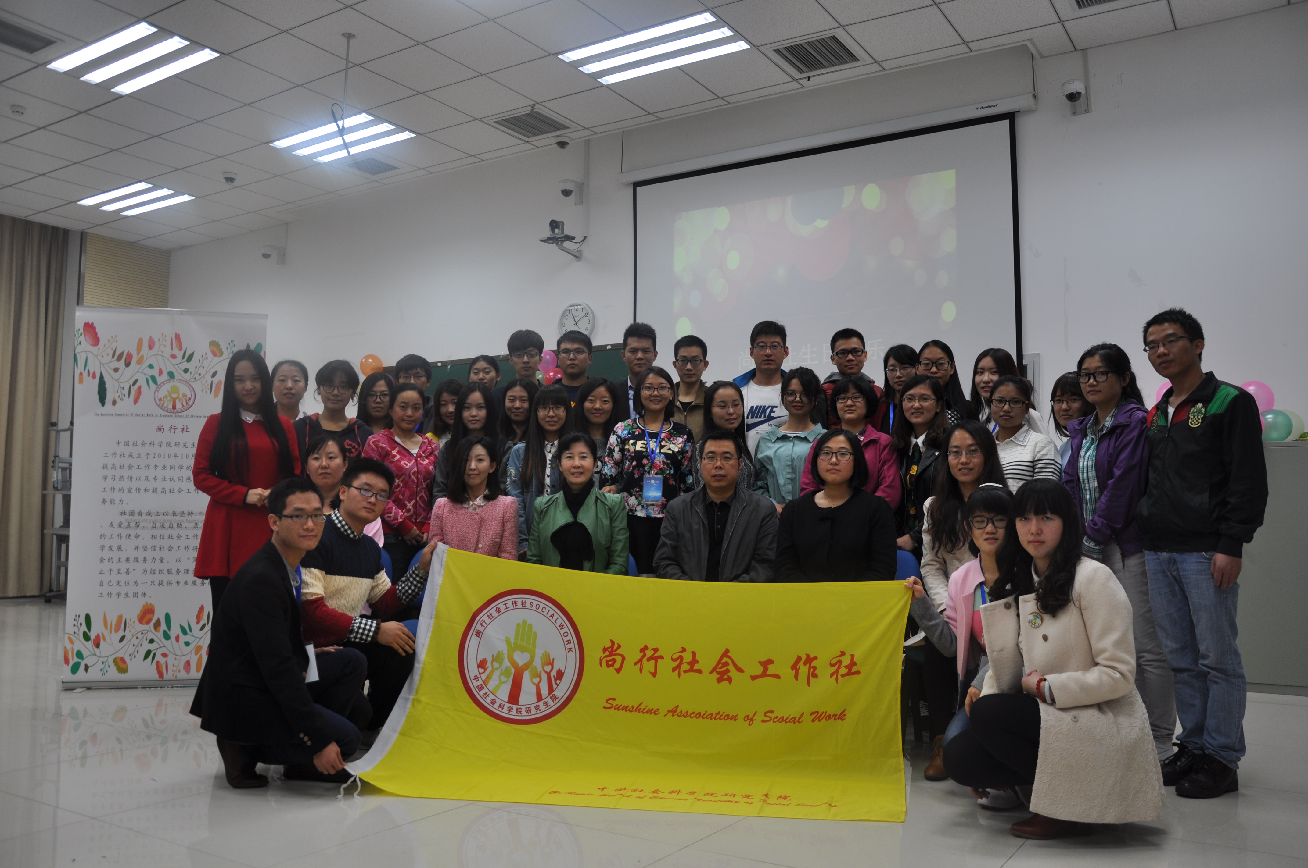 活动最后进行会旗交接仪式,第五届尚行社成员将旗子交到第六届成员手中,代表尚行社交接正式完成,新一届成员将在中心领导下发挥更大的潜力,创造尚行社更好的明天,最后全体人员合影留念。