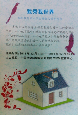 宿舍文明月活动是中心一个特色学生活动,继2010级社工硕士举办第一届之后,2011级社工硕士积极参与本次活动。宿舍卫生状况的改善、宿舍安全文明意识的提升、舒适优雅的宿舍环境使得大家学习之余与舍友的相处愈加愉快。秀个性风采、秀良好习惯、秀出自我对两年崭新硕士生活的期待,2011级社工学子们在共同创造!
