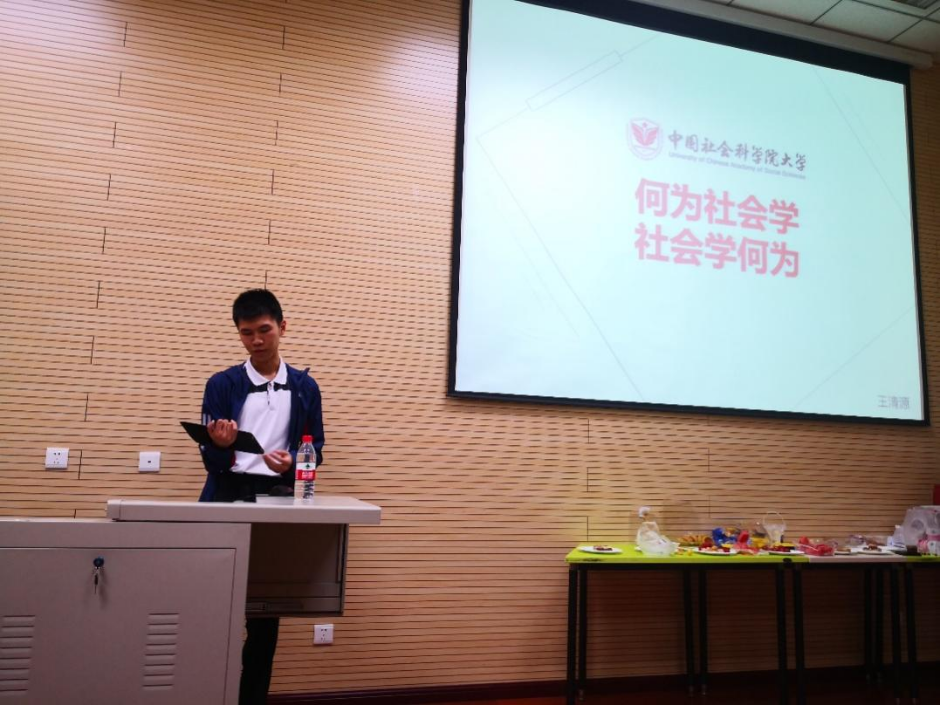 第二位主讲人王清源同学从社会学产生的大历史背景,社会学的目的与理想,社会学的现状与困境等角度分享了他对社会学学科、社会学学习的思考。