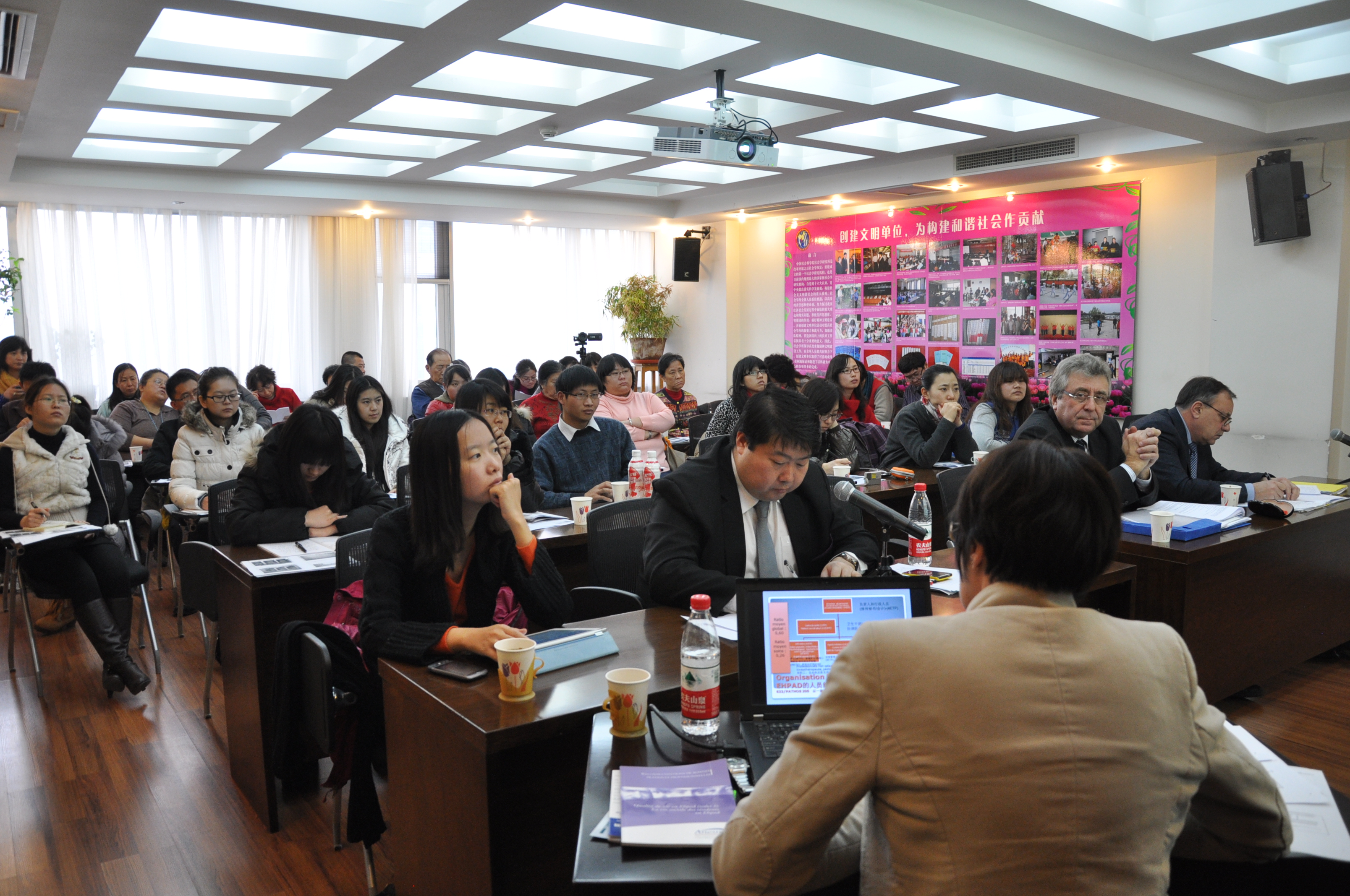 上午9时,讲座正式开始,讲座的主题主要围绕“失能老人养老寓所—EHPAD”的生活场所与照料场所的环境、EHPAD的行政结构、EHPAD的人员组成、EHPAD的空间布局以及对养老机构的评估和质量管理措施等几个方面进行探讨。Isabelle Barges女士用了大量的图片和案例生动的讲解了法国养老机构EHPAD的基本情况、发展模式和人员的培养,也介绍了法国政府对于养老的一些政策和法国人对老年生活的一些看法。讲课结束后,北京各社工机构争相提出自己所面临的问题,法国专家全部一一认真进行了解答,气氛非常热烈,讲座活动一直延迟到中午12时结束。