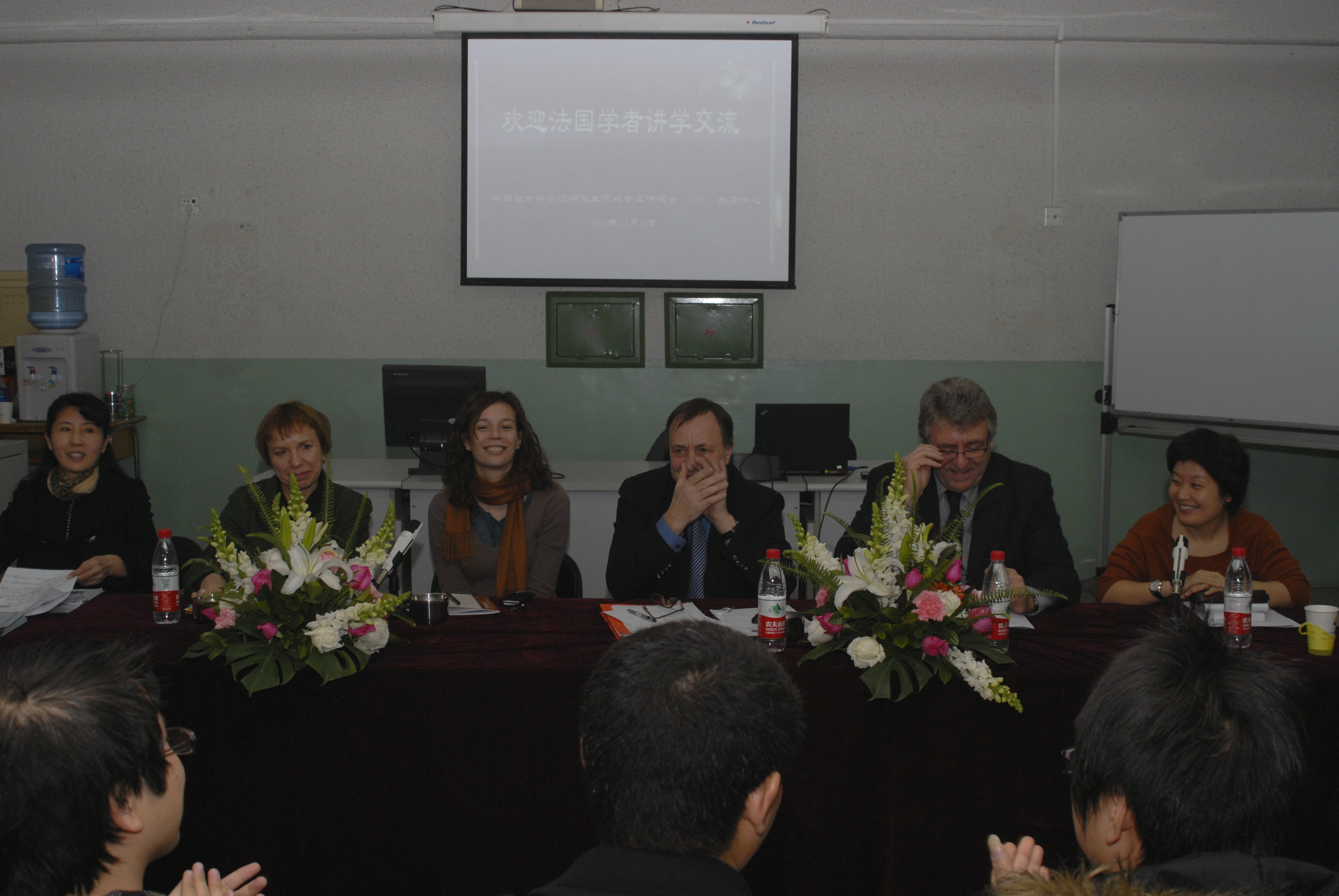 20日上午9点,三位法国专家在研究生院为中心57名社会工作专业研究生举行学术讲座。雷欣格教授做了题为“法国社会政策与社会保障”的演讲,她从工业革命开始说起,展示了法国社会保障体制的发展历程、组成要素、社会保险的费用分摊以及目前经济危机背景下法国面临的挑战。薄乐艺主任做了题为“国家职业培训中心网络与法国社会工作领域专业人士密切合作”的演讲,重点介绍了法国BUC资源中心的基本情况以及他们如何培训专业人员,为现场的学生展现了一幅国家职业培训中心网络与法国社会工作领域专业人士密切合作的图景。贾杰教授做了题为“社会工作教育与研究”的演讲,他详细介绍了任教的法国国立科学技术与管理新澳彩论坛