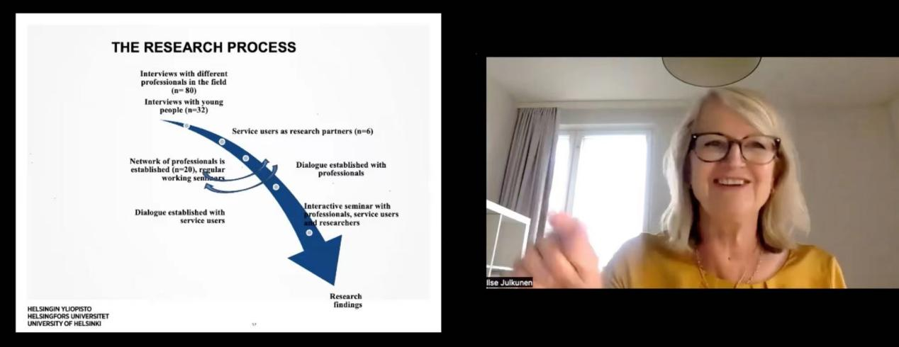 在实证研究部分,Ilse julkunen教授阐述了研究背景。该项目关注青年人精神健康问题,认为世界各地都存在青年人受到精神健康困扰的问题,并因此很难融入社会。这样的例子屡见不鲜,并且呈现逐年递增趋势,在赫尔辛基每5个人中就有1个年轻人受此困扰。如在新冠肺炎疫情发生的第一年,芬兰停课停学,不少青年独自在家,见亲人也比较困难,这对青年人的精神健康影响很大。这些青年若需要精神健康服务就需要拿到医院的诊断,而且目前提供精神健康服务的很多机构良莠不齐,对于真正需要精神健康服务的人群帮助不大。