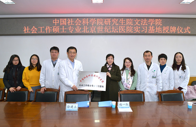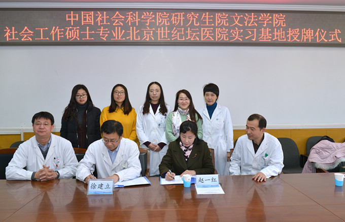 院长赵一红、社工专业实习管理办公室主任郑玲、赵宗宇和两名社工研究生以及北京世纪坛医院院长徐建立、医务处处长王勇、教育处处长朱斌、医务社会工作管理办公室主任吴薇等相关部门人员出席了本次签约授牌仪式。