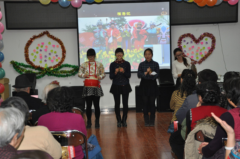 联欢会开始前,太平桥西里社区居委会程书记代表社区对于中心师生的到来表示热烈的欢迎和诚挚的谢意。社工中心的郑玲老师为晚会致辞,郑玲向在座的老人介绍了我中心的基本情况以及我们举行本次联欢会的主题及目的,向对本次活动给予很大支持的社区居委会领导及工作人员表达了诚挚的谢意,向出席联欢会的老人送去了节日的祝福,同时对于未来一年学生在社区开展居家养老服务专业实习和同社区共建实习实践基地给予了很高的期望!随后一支活力四射的啦啦操表演拉开了联欢会的序幕,啦啦操表演既展现了90后的青春魅力,也点燃了老人的热情。小品《走进社区》生动形象地向社区老年人展现了社会工作者在社区开展工作的具体细节,让老年人对我们的工作有了初步的认识和最直观的理解。相声《拜师》、三句半《福寿禄》诙谐生动的表演引来了现场一阵阵的掌声和笑声。由中心学生周雅程演唱、社区舞蹈队伴舞的歌舞秀《小苹果》将现场的气氛推向了高潮。由中心学生和社区合唱队共同演唱的红色歌曲《阳光路上》和《歌唱祖国》激发了大家的爱国热情,调动了现场观众的参与热情,大家纷纷跟着演唱;歌曲《外婆的澎湖湾》、《常回家看看》、方言朗诵《相信未来》等勾起了大家无限的乡思,触及了大家对家庭、对亲人、对家乡的无限回忆和思念。游戏互动环节,充分展现了老年人的参与愿望和参与热情,众多老人参与到“听歌曲、猜歌名”游戏活动中,展现了老年人的风采,游戏结束后,中心老师上台为参与活动的老人颁发了礼品;最后,部分老年人代表上台与学生合影留念,联欢会在14级全体同学大合唱《虫儿飞》的歌声中圆满落下帷幕。