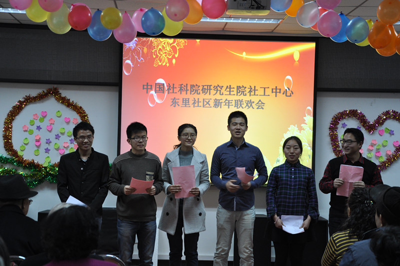 2014年12月29日下午和12月30日上午,“走进社区、关爱老人”迎新年大型社区联欢活动分别在丰台区太平桥东里社区和太平桥西里社区隆重举行。本次联欢会在社工中心主任赵一红老师、郑玲老师和赵宗宇老师的指导下,由14级学生自编自导自演,节目内容丰富、形式多样,迎合老人爱好,贴近老人生活,为社区的老年人带来了新年的祝福,送上了一场丰富多彩的文艺演出!中心通过举办社区新年联欢会旨在丰富社区老年人的晚年生活,提高年轻人关爱老人的意识,同时也加强中心与社区之间的交流,为共建实习实践基地打下良好的基础。