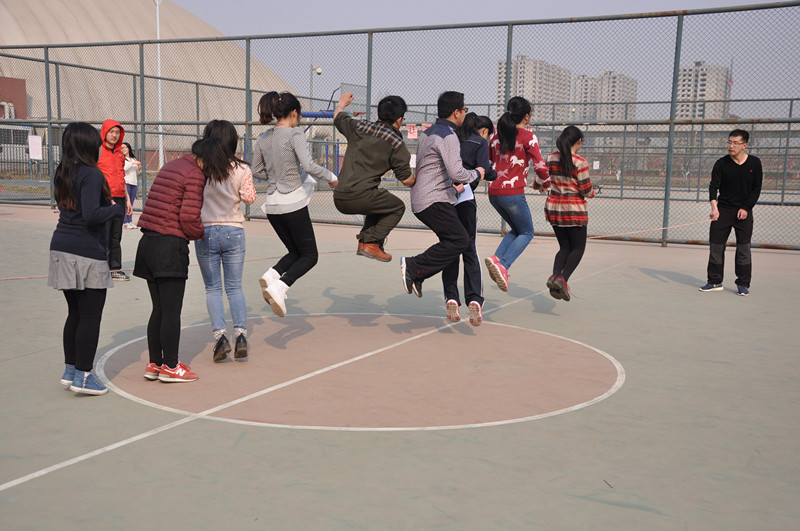 第二部分是游戏接龙,此部分由单人跳绳、踢毽子、背投球、夹豆子、集体大跳绳等若干个独立游戏连接而成,团队成员需相互配合,以最短的时间完成所有项目。这个游戏成功的增强了成员之间的合作能力,培养了团队内部相互协作的默契。