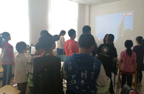 接着,双方通过观看升旗视频,将主题逐步引入到手工小组的作品上来。梁永博先带领组员认识材料、了解制作方法。驻点社工将材料分发到每一位组员的手中,鼓励大家跟着社工一起动手制作升旗台模型。大家自发地围坐在驻点社工的四周,全神贯注地投入到国旗升降台模型的制作中——选材、粘胶、组合、固定、装扮。在组员的共同努力之下,升旗台模型全部制作完成。最后,组员们拿着自己完成的升旗台模型,切身感受了一次模拟的升旗仪式。