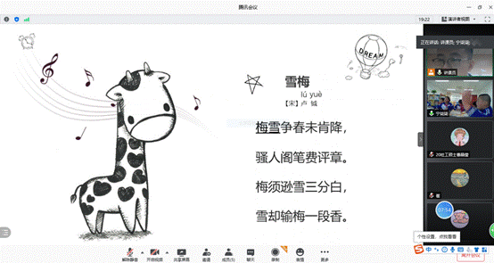 首先进行的是语文课的分享。作为本次语文课的引入环节,崔宝瑞同学利用生动有趣的动画形式,为同学们讲述了精卫填海的故事。一位听课同学自告奋勇复述了这个故事,可以看出孩子们语言表达能力和概括能力的提升。随后,崔宝瑞带领大家一起学习了《雪梅》这首古诗,将重点放在了古文翻译、生字学习等方面。在本节课的最后阶段,已经有不少同学可以背出这首古诗了。