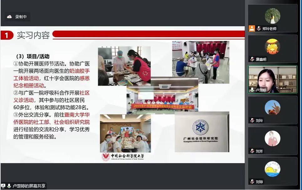 首先,郑玲老师向大家介绍了此次实习汇报会的基本流程、汇报内容和其他注意事项。本次汇报分为上下午,两个班分别进行。在汇报阶段,社工学生通过PPT展示,从实习单位介绍、实习内容、实习收获和实习反思等多个方面进行了总结与分享。此次实习中,同学们的实习领域涵盖了社区社会工作、儿童社会工作、医务社会工作、老年社会工作、司法社会工作、行政社会工作等多个领域,服务对象包括困境儿童、残障人士、老年人等多个群体,覆盖范围十分广泛,实习内容包括开展社区入户探访、个案服务、小组活动、各类主题活动以及社工站建设等方面。
