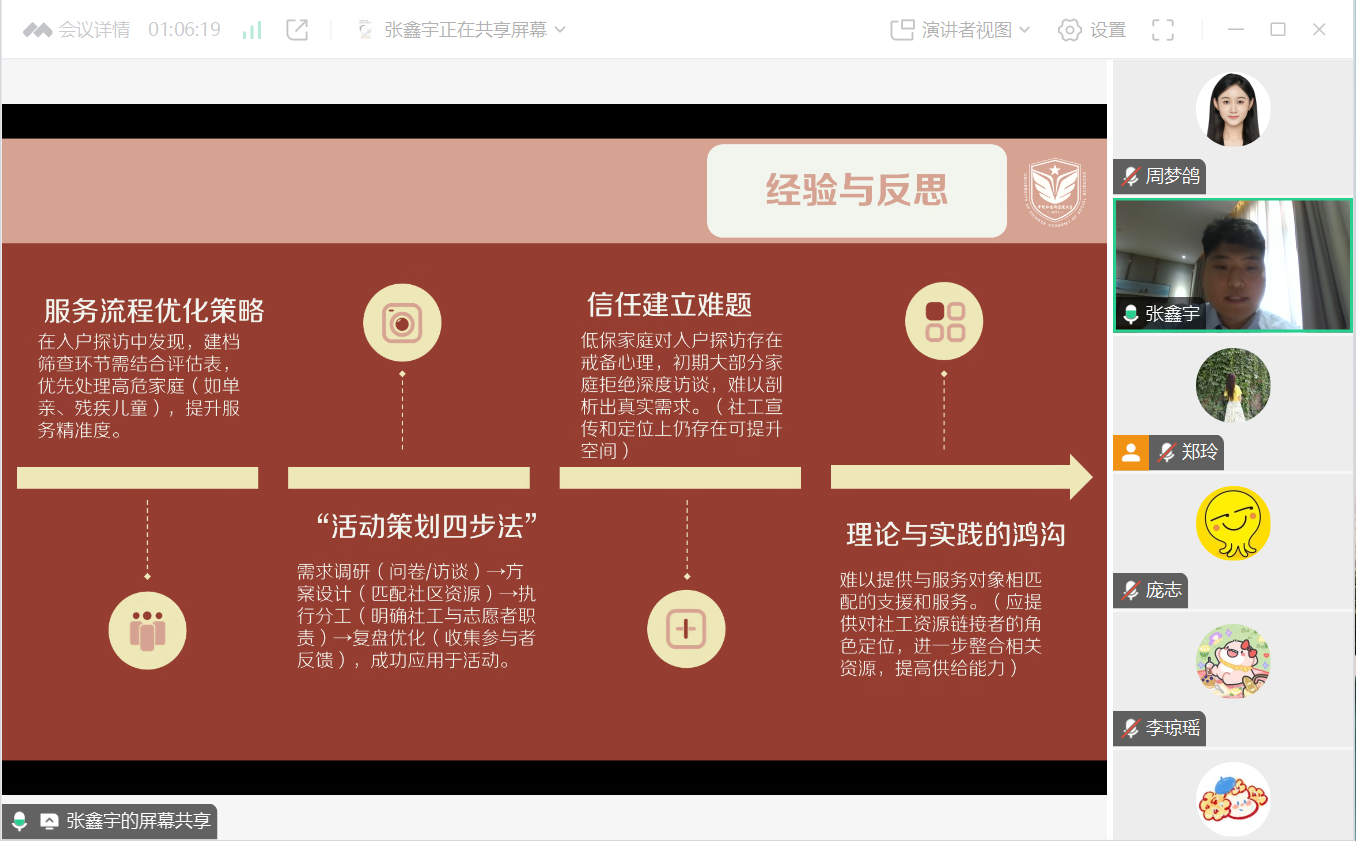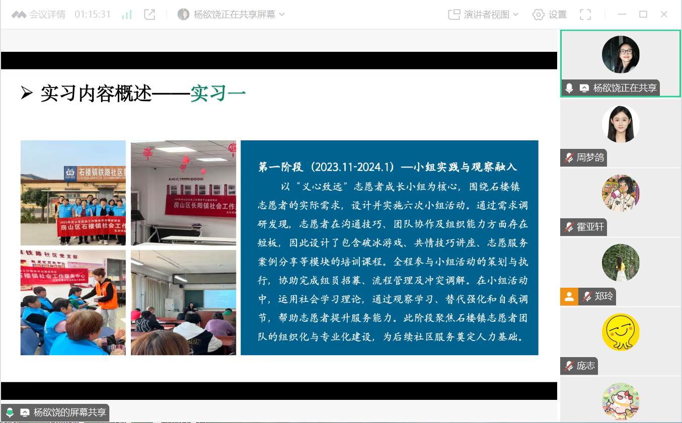在此次实习汇报中,各位同学纷纷分享了自己在社会工作专业实践中的宝贵经验和深刻感悟。例如,马小可同学跟随社工机构积极参与校舍融合建设熟人社区以及大学志愿者培训项目,在实践过程中,她深刻领悟到策划方案时将社工理论融入其中的重要性,并提出要注重倾听督导的意见和建议;杨欲饶同学将实习划分三阶段,运用相关专业理论为服务对象赋能,同时也总结了自己在小组、社区等社工服务领域方面的成长;张鑫宇同学则从自己的实习经历中总结出了“活动策划”四步法,为今后的相关工作提供了清晰的思路和方法指引,有助于提高实际工作的效率和质量;李辰茜同学在什刹海街道困难群众救助服务所实习期间,跟随社区工作人员走访了解居民情况,还开展了多项个案服务,如入户探访与政策解读,为他们争取更多资源支持,以更好地服务案主;陈柯燃同学以家暴目睹儿童为服务对象,开展了反家暴剧团、“同心圆”女性支持小组、“小熊猫”儿童零暴力成长计划等专业服务,她意识到,社工的力量可以更好更高效更广阔范围的发挥,在儿童保护领域的干预可以更加精准;王筠焯同学表示,社会工作者最重要的能力就是与服务对象建立信任关系,信任关系的建立是一切服务的前提,她在服务对象接触的过程中体会到人与人之间纯粹的美好,并会带着这份感动与热爱去开展服务,让自己的服务更有温度。