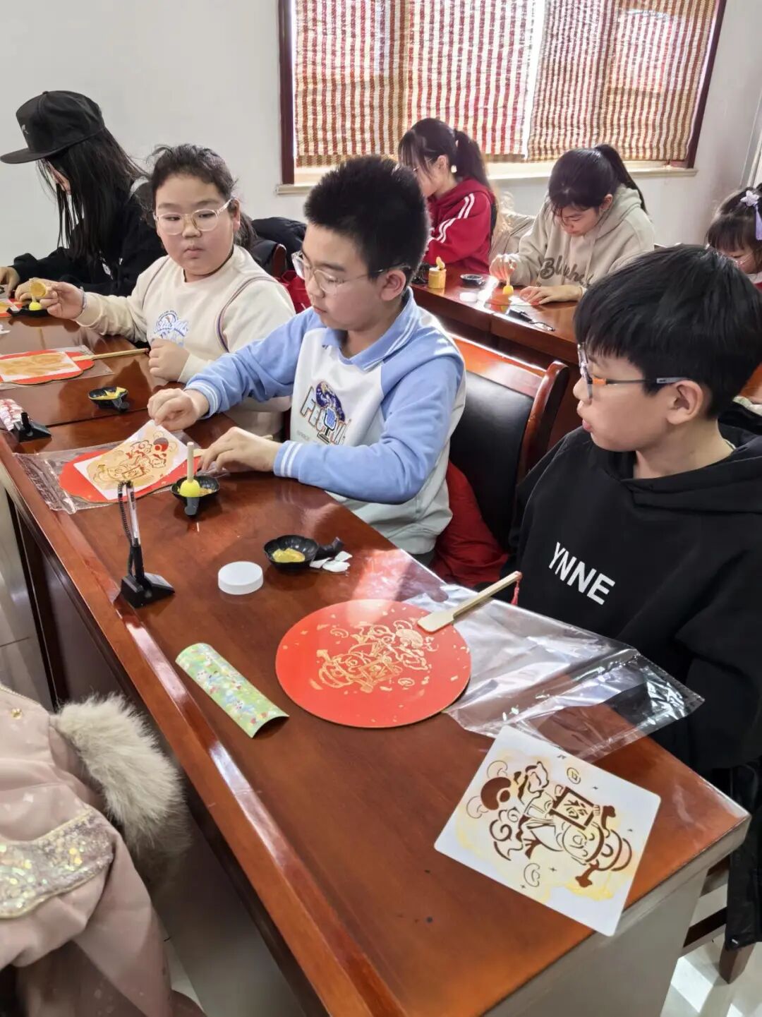 创作过程中,孩子们充分发挥想象力,展现出极强的创造力。有的孩子借助模板拓印出古典纹样,再用淡雅色彩填充,尽显雅致韵味;有的孩子跳出模板束缚,自主绘制花朵、柿子等图案,搭配鲜艳色彩,充满童真活力;还有的孩子在扇面角落添加福字、祥云等元素,赋予作品新春祝福。社工穿梭在孩子们中间,耐心指导动手能力较弱的孩子绘制,及时解答大家遇到的创作难题,同时细心提醒孩子们注意颜料使用安全,全程给予孩子们充分的支持与鼓励。