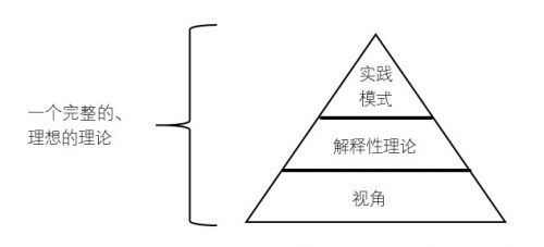 在该图中,一个完整的、理想的理论以一定的视角(假设)为基础,有一定的解释和说理过程,最后还要有一定的实践模式来指导人们开展具体工作。