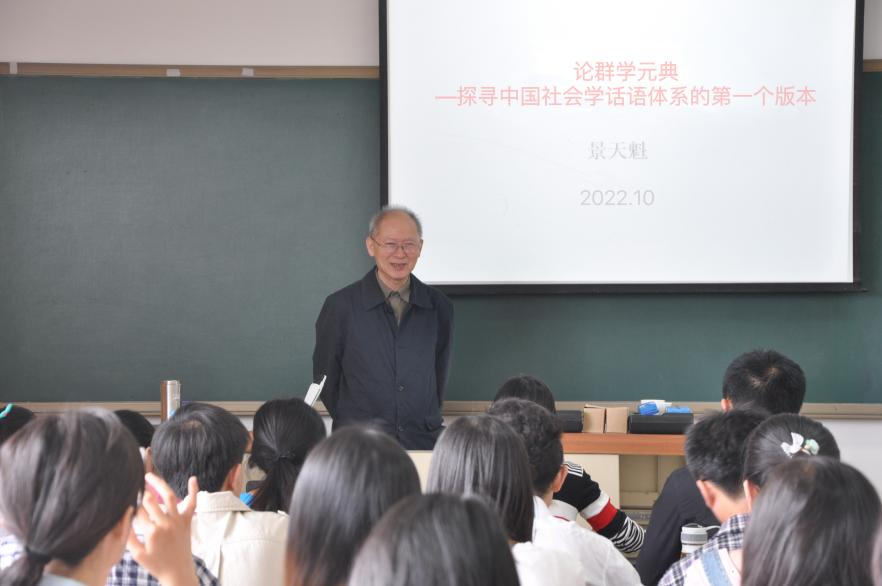 讲座伊始,景天魁研究员向同学们介绍了自己正在从事的学术事业,即力求梳理中国社会学的发展脉络,在中国古典文化中为社会学寻根。同时,景天魁研究员还向在座的各位同学介绍了研究群学元典的重要意义,以此激励同学们树立远大学术理想,敢想敢为,善作善成,以敢担当、能吃苦、肯奋斗的精神风貌,投身于中国特色、中国风格、中国气派的社会学建设,以实际行动献礼党的二十大。