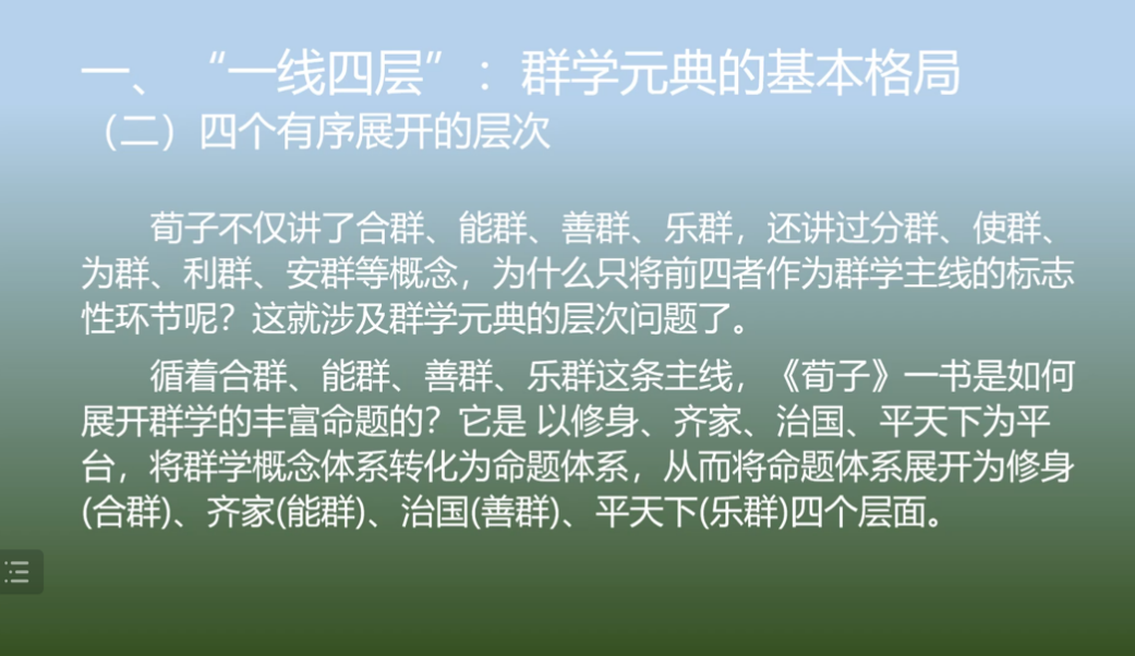 • 群学具有“四海一家”的“天下观”,乐群是群学的最高追求与理想境界。荀子指出,乐群要坚持“天下为公”理念,认为“公则天下平”是社会秩序稳定和谐的保证;乐群就是要把“以和为贵”作为基础,坚持“和而不同”,采取“兼爱相利”,以实现天下大同。天下大同是群学的使命与抱负。