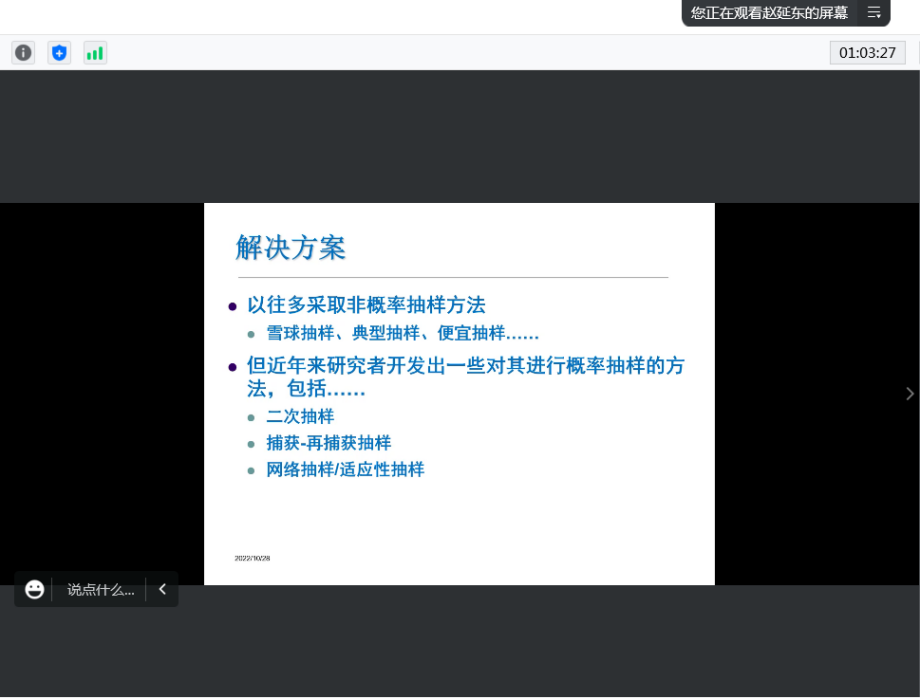 2022年10月28日下午两点,中国人民大学社会与人口新澳彩论坛 教授,中国人民大学北京社会建设研究院首席专家赵延东教授主讲的“如何对总体不明群体开展概率抽样调查”研究生经典学术讲堂在腾讯会议线上举行。本次讲座由新澳彩论坛 教授、博士生导师李炜教授主持,线上百余名同学参加。