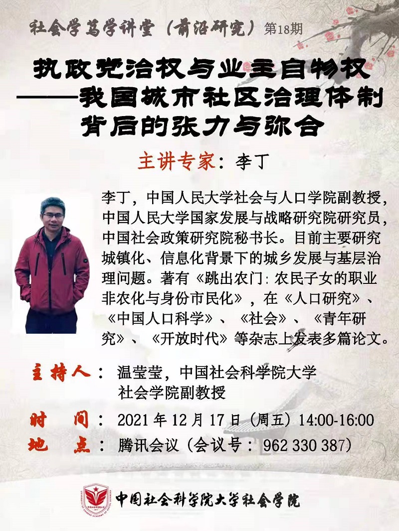 社会学笃学讲堂(前沿研究)第18期—李丁:执政党治权与业主自物权—我国城市社区治理体制背后的张力与弥合