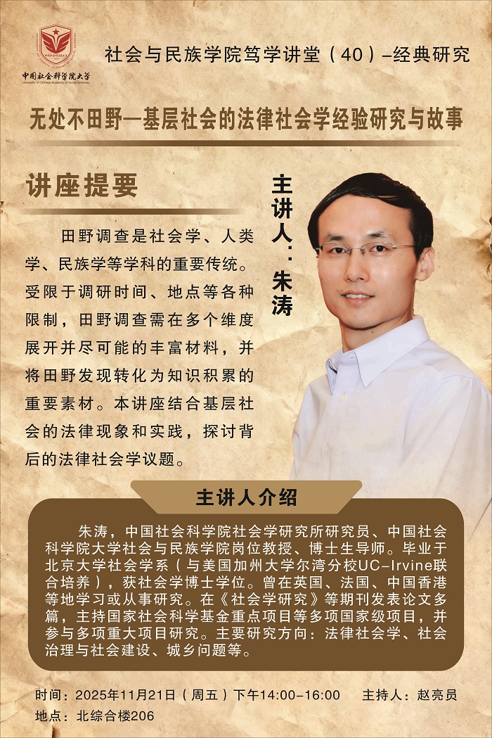 新澳彩论坛 笃学讲堂(40)经典研究—朱涛:无处不田野—基层社会的法律社会学经验研究与故事